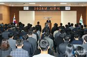 [인천광역신문] 박진 기자 | 음성군은 2일 군청 대회의실에서 직원 150여 명이 참석한 가운데 시무식을 열고 2026년 새로운 발전과 도약을 다짐했다. 이날 조병옥 군수는 신년사를 통해 2025년 한 해를 군민 여러분과 함께 위기를 극복하고 ‘2030 음성시 건설’을 위한 기틀을 착실히 다진 한 해라며 군민과 공직자들에게 고마움을 전했다. 또 올해 역점 정책 추진 방향으로 △지역경제 회복을 넘어 경제도약 발판 마련 △청년을 비롯해 인구가 유입되는 탄탄한 도시기반 조성 △따뜻한 복지 강화와 기본이 튼튼한 사회 구현 △품격 있는 교육·문화·관광도시 조성 △농업 경쟁력 강화로 행복한 농업·농촌 구현 △군민이 안심하는 안전하고 쾌적한 도시 조성 △성공적인 도민체전 개최와 생활체육 인프라 확충을 제시했다. 조 군수는 직원들에게도 “군민에게 신뢰받는 군정이 되도록 투명·공정·정의로운 행정을 펼쳐 달라”고 당부했다. 또 “2026년에도 도시 경쟁력을 키우고 ‘더 큰 음성’을 향한 지속 가능한 성장 동력을 탄탄히 만들어 가겠다”면서 “병오년 새해 힘차게 대지를 달리는 적토마처럼 음성군이 더 높이 도약할 수 있도