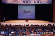 [인천광역신문] 박진 기자 | 청주시는 2일 청주예술의전당 대공연장에서 2026년 시무식을 개최하고 새해 시정 운영의 힘찬 출발을 알렸다. 이날 시무식에는 이범석 청주시장, 신병대 부시장을 비롯한 시 직원들과 산하기관 관계자 등 1천200여명이 참석해 새해 각오를 다졌다. 행사 전에는 직원 간 담소 시간이 마련됐으며, 오전 9시부터 국민의례를 시작으로 시장 신년사, 시립예술단 공연, 신년 인사가 순서대로 진행됐다. 이범석 시장은 신년사에서 “민선8기 청주시가 지금까지 시민과 이룬 성장과 변화는 뿌리 깊은 나무가 되어 어떤 비바람에도 흔들리지 않는 밑거름이 됐다”면서 “그 기반을 바탕으로 2026년을 청주의 더 큰 미래와 번영을 향해 나아가는 ‘개화공영(開花共榮)’의 해를 만들겠다”고 밝혔다. 이어진 시립예술단 공연에서 합창단은 ‘우리가 청주다’ 곡을 선보이며 새해를 여는 희망의 메시지를 전했고, 시장과 간부 공무원들은 사무실로 향하는 전 직원과 신년 인사를 나누며 2026년 시정 목표 달성을 위한 의지를 다졌다. 한편, 청주시는 2026년 화두로 개화공영을 선정했다. 민선