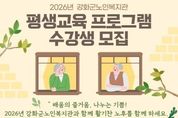 [인천광역신문] 박진 기자 | 강화군노인복지관(관장 윤심)이 오는 12일~16일, 어르신들의 활기찬 노후와 평생학습 기회 확대를 위한 ‘2026년 평생교육 프로그램’ 수강생을 모집한다고 밝혔다. 2026년 평생교육 프로그램은 강화군에 거주하는 만 60세 이상의 어르신을 대상으로 진행되며 ▲건강 증진 6과목 12강좌 ▲교양교육 13과목 24강좌 ▲여가․취미 18과목 30강좌 ▲정보화 1과목 3강좌 ▲기획프로그램 6과목 9강좌 등 어르신들의 관심과 수요를 반영한 다양한 프로그램으로 구성된다. 노인복지관은 이번 프로그램을 통해 어르신들이 일상에서 배움을 이어가고 사회적 교류를 확대할 수 있도록 지원한다는 계획이다. 접수는 1월 12일~16일까지 진행되며, 강화군노인복지관으로 방문 접수가 가능하다. 모집인원 초과 시에는 공정성을 위해 컴퓨터 추첨을 통해 수강생을 선발할 예정이다. 2026년 평생교육 프로그램은 오는 2월 2일~12월 11일까지 운영될 예정이다. 윤심 관장은 “평생교육 프로그램은 단순한 여가 활동을 넘어 어르신들의 자기 계발과 사회참여를 돕는 중요한 역할을 지닌다”며, “많은 어