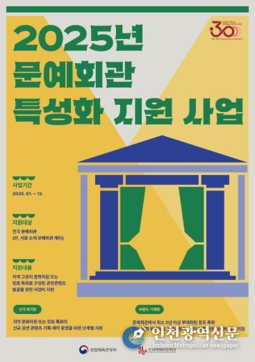 [인천광역신문] 관리자 기자 | 문화체육관광부는 한국문화예술회관연합회와 함께 올해 1월부터 2월까지 전국 문예회관(서울 소재 문예회관 제외)을 대상으로 ‘2025년 문예회관 특성화 지원 사업’을 공모하고, 1차 심의(3. 5.~7.)와 2차 심의(7. 7.~9.)를 거쳐 ‘브랜드 기획형’ 8개 ‘신작 제작형’ 10개 등 문예회관 총 18곳을 최종 지원 대상으로 선정했다.