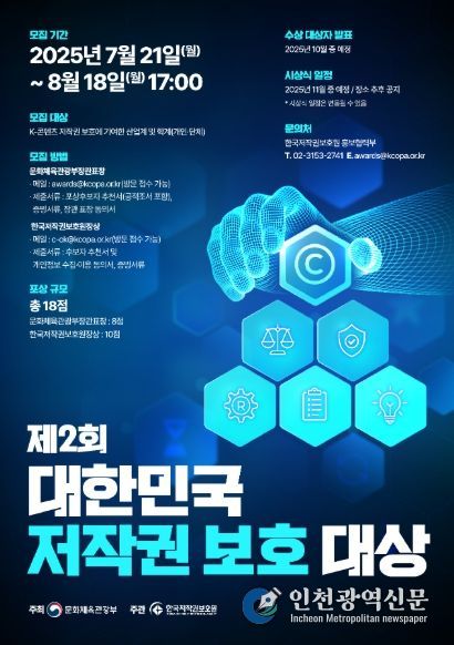 [인천광역신문] 관리자 기자 | 문화체육관광부는 한국저작권보호원과 함께 7월 21일부터 8월 18일까지 ‘제2회 대한민국 저작권 보호 대상’ 후보자에 대한 대국민 추천을 받는다.