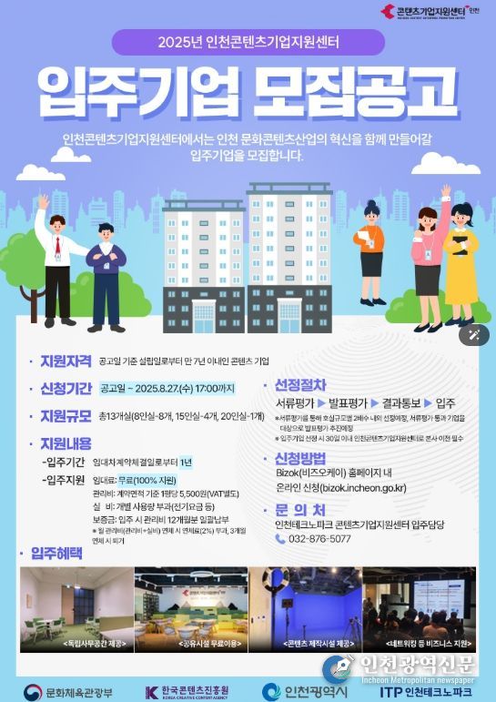 [인천광역신문] 최예준 기자 | 인천테크노파크(인천TP)는 부평구에 있는 인천콘텐츠기업지원센터에 입주할 입주기업 13개 사를 신규 모집한다.
