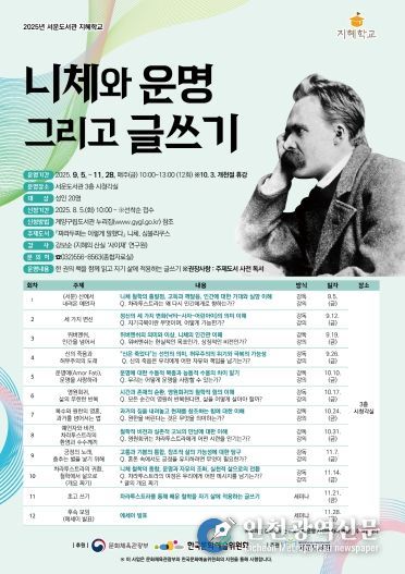 프로그램은 9월 5일부터 11월 28일까지 매주 금요일 오전 10시부터 오후 1시까지 진행되며, 모집 대상은 성인이다. 참가자들은 강사의 안내에 따라 니체 철학의 핵심 개념을 이해하고, 강독을 통해 저자의 사유 흐름을 따라가며, 글쓰기 활동을 통해 자기 삶을 성찰하는 시간을 갖게 된다.