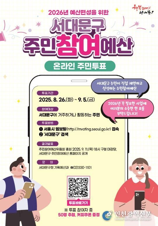 [인천광역신문] 최훈 기자 | 서대문구는 주민참여예산위원회가 8월 26일부터 9월 5일까지 2026년 주민참여예산사업 선정을 위한 온라인 투표를 진행한다고 밝혔다.