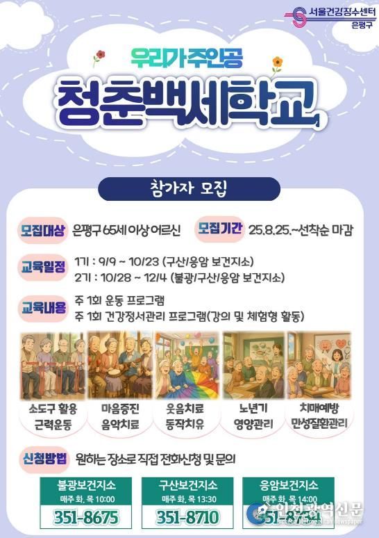 [인천광역신문] 최훈 기자 | 서울 은평구는 서울건강장수센터에서 지역 어르신들의 건강한 노후와 활기찬 사회참여를 위해 내달부터 하반기 ‘청춘백세학교‘를 개강하고 참가자를 모집한다고 밝혔다.