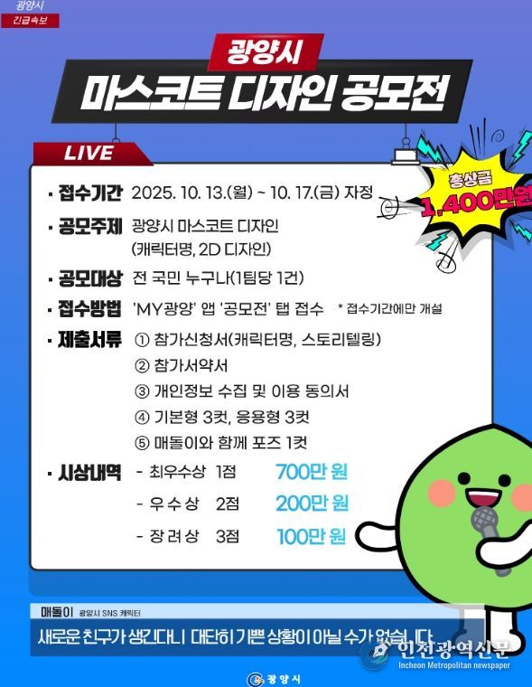 광양시 관계자는 “이번 공모전은 앞으로 광양시를 대표할 새로운 마스코트를 전 국민과 함께 만들어가는 과정”이라며 “시의 정체성과 상징성을 담은 독창적인 캐릭터가 선정될 수 있도록 많은 관심과 참여를 부탁드린다”고 말했다.
