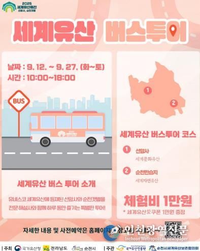 [인천광역신문] 관리자 기자 | 순천시와 순천시 세계유산보존협의회는 오는 12일부터 27일까지 ‘2025 세계유산축전 선암사, 순천갯벌’ 버스투어 프로그램을 운영한다고 밝혔다.