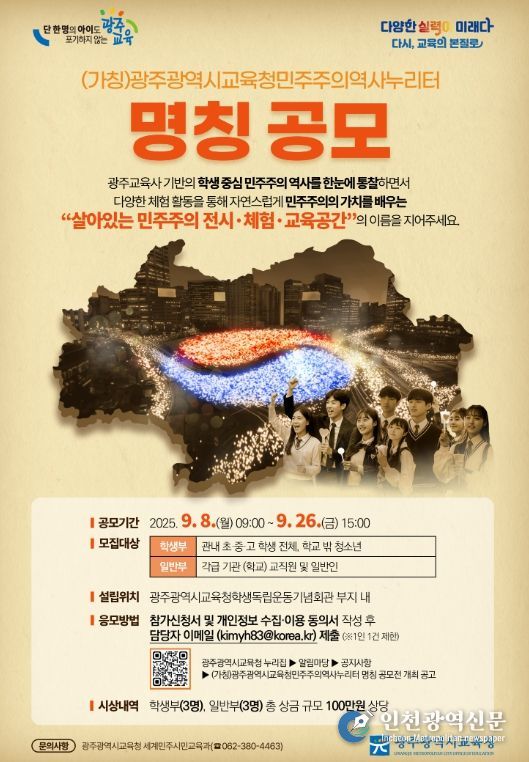 [인천광역신문] 관리자 기자 | 광주시교육청이 새롭게 건립하고 있는 민주주의 전시·체험공간 ‘(가칭)광주광역시교육청민주주의역사누리터의 명칭을 공모한다.