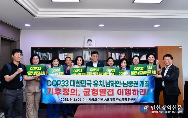 [인천광역신문] 관리자 기자 | 여수시의회는 지난 3일 국회를 방문해, ‘제33차 UN기후변화협약 당사국총회(COP33) 유치 약속 이행 촉구 건의안’을 환경노동위원회 안호영 위원장에게 직접 전달했다.