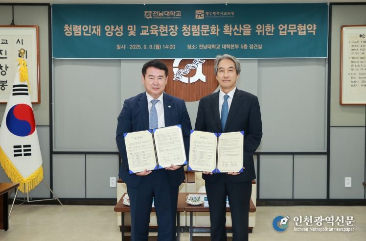 [인천광역신문] 관리자 기자 | 전남대학교와 광주시교육청이 청렴 인재 양성과 교육현장 청렴 문화 확산을 위해 협력한다. 양 기관은 업무협약을 체결하고 미래세대가 청렴한 시민으로 성장할 수 있도록 공동 노력을 기울이기로 했다.