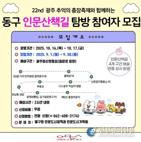 [인천광역신문] 관리자 기자 | 광주 동구는 ‘제22회 광주 추억의 충장축제’ 개최 기간 중인 오는 10월 16~17일 이틀간 금남로와 충장로 일원에서 ‘동구 인문 산책길 탐방 프로그램’을 운영한다고 밝혔다.