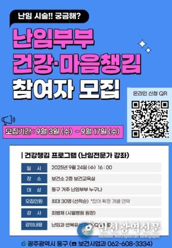 [인천광역신문] 관리자 기자 | 광주 동구는 오는 24일 난임으로 어려움을 겪고 있는 지역 부부들에게 난임에 관한 올바른 정보와 실질적인 조언을 제공하는 ‘난임부부 건강 챙김 강좌’를 진행한다고 밝혔다.