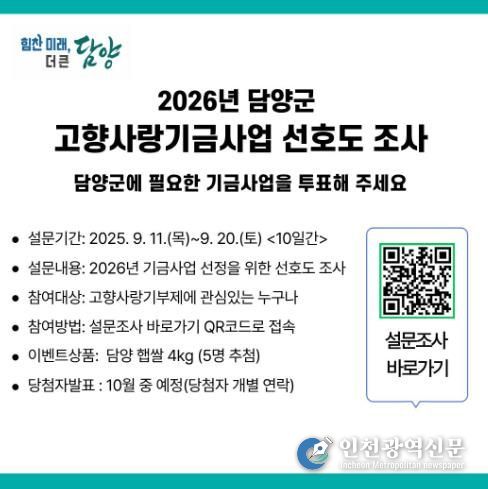[인천광역신문] 관리자 기자 | 담양군은 2026년 고향사랑기금사업 선정에 기부자와 군민의 의견을 반영하기 위해 11일부터 20일까지 10일간 ‘담양군 고향사랑기금사업 선호도조사’를 진행한다.