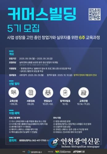 [인천광역신문] 관리자 기자 | 광주 동구는 창업 아이템을 보유한 청년 창업자를 대상으로 오는 26일까지 ‘커머스빌딩 5기’ 교육생을 모집한다고 밝혔다.
