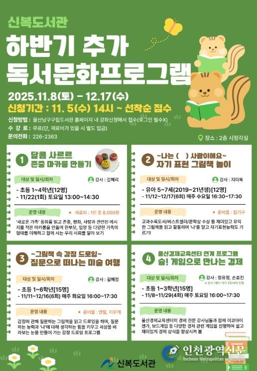 [인천광역신문] 관리자 기자 | 울산 남구 신복도서관은 11월을 맞아 지역 주민들에게 더욱 다양한 독서문화활동과 평생교육의 기회를 제공하기 위해 ‘하반기 추가 독서문화프로그램’을 운영한다고 밝혔다.