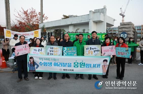 [인천광역신문] 관리자 기자 | 제천시의회는 13일 오전, 2026학년도 대학수학능력시험을 치르는 지역 수험생들을 응원하기 위해 제천여자고등학교, 제천제일고등학교, 제천고등학교 등 관내 3개 시험장을 차례로 방문했다.