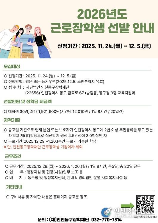 [인천광역신문] 최예준 기자 | (재)인천동구장학재단은 지역 대학생들을 대상으로 ‘2026년도 근로장학생’을 선발한다고 밝혔다.