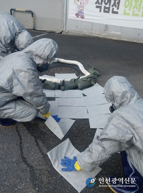 훈련에는 남동구 및 사업장 직원 등 20여 명이 참여해 보호의, 방독면 등을 착용한 상태로 케미컬 흡착포, 소석회 등을 이용한 방제작업을 진행했다.