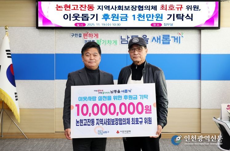 [인천광역신문] 최예준 기자 | 인천시 남동구는 논현고잔동 지역사회보장협의체 최호규 위원으로부터 이웃돕기 성금 1천만 원을 기탁받았다고 24일 전했다.