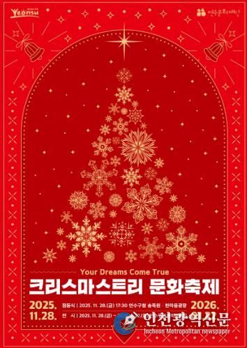 [인천광역신문] 최예준 기자 | 연수구가 주최하고 (재)연수문화재단이 주관하는 ‘2025 크리스마스트리 문화축제’가 내년 1월 22일까지 구청 1층 송죽원과 한마음광장, 연수구 제2청사에서 열린다.