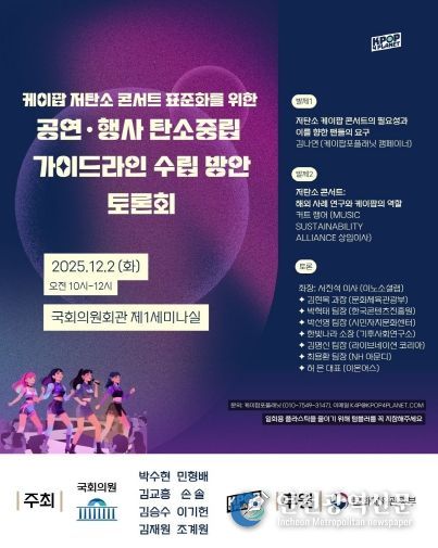 [인천광역신문] 관리자 기자 | 국회 문화체육관광위원회 박수현 의원(더불어민주당·충남 공주·부여·청양)은 12월 2일 (화) 오전 10시 국회의원회관 제1세미나실에서 문화체육관광위원회 김교흥 위원장, 김승수·김재원·민형배·손솔·이기헌·조계원 의원과 함께 ‘케이팝 저탄소 콘서트 표준화를 위한 공연 행사 탄소중립 가이드라인 토론회’를 개최한다.
