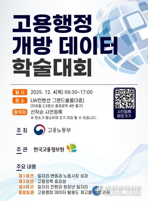 [인천광역신문] 관리자 기자 | 고용노동부 한국고용정보원은 12월 4일 LW컨벤션센터(서울) 그랜드볼룸홀에서 고용노동부와 공동으로 ‘고용행정 개방 데이터 학술대회’를 개최한다고 밝혔다.