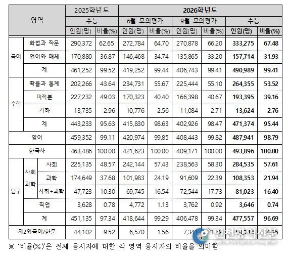 2026학년도 수능에 응시한 수험생은 493,896명으로 재학생은 333,102명, 졸업생과 검정고시 합격자 등은 160,794명이었다.