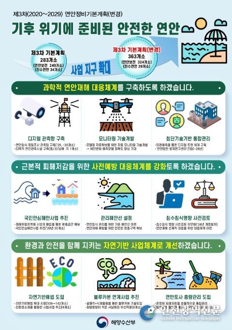 [인천광역신문] 관리자 기자 | 해양수산부는 2020년도에 수립된 ‘제3차 연안정비기본계획’의 타당성을 검토하고 연안재해 대응 역량을 강화하기 위해 ‘제3차(2020~2029) 연안정비기본계획(변경)’을 수립하여 고시한다고 밝혔다.