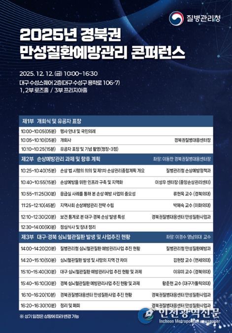 [인천광역신문] 관리자 기자 | 질병관리청 경북권질병대응센터는 12월 12일 10시 대구 수성스퀘어에서 지역사회 만성질환 관리 협력체계 강화를 위한 '2025년 경북권 만성질환예방관리 콘퍼런스'를 개최한다.