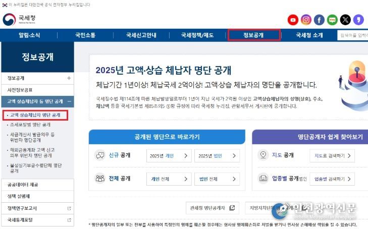 [인천광역신문] 관리자 기자 | 국세청은 국세체납액이 2억 원 이상인 고액・상습체납자의 인적사항 등을 국세청 누리집을 통해 공개했다.
