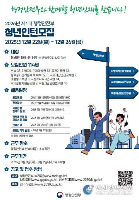 [인천광역신문] 관리자 기자 | 행정안전부는 청년들이 다양한 행정 분야에서 근무 경험을 확대하고, 공공분야 정책 참여 기회를 제공하기 위하여 2026년 제1기 청년인턴을 114명 채용한다고 밝혔다.