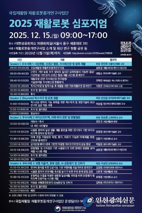 [인천광역신문] 관리자 기자 | 보건복지부 국립재활원은 12월 15일 대한상공회의소 의원회의실(서울 중구)에서 '2025 재활로봇 심포지엄'을 개최했다. 이번 행사는 국립재활원 재활로봇중개연구사업단에서 수행 중인 다양한 재활로봇중개연구를 소개하고 국내 재활로봇 연구 분야(산‧학‧연‧병) 연구자들이 연구 결과를 공유하면서 재활로봇중개사업을 확산하기 위한 목적으로 마련됐다.