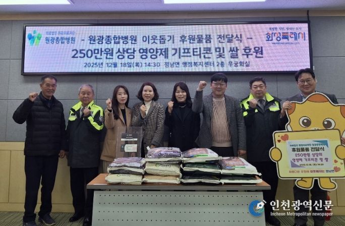 [인천광역신문] 박진 기자 | 의료법인 원광의료재단 원광종합병원은 지난 18일 연말을 맞아 어려운 이웃들과 따뜻한 정을 나누기 위해 정남면을 방문해 250만 원 상당의 면역증강 영양주사 쿠폰 및 쌀을 기탁했다.