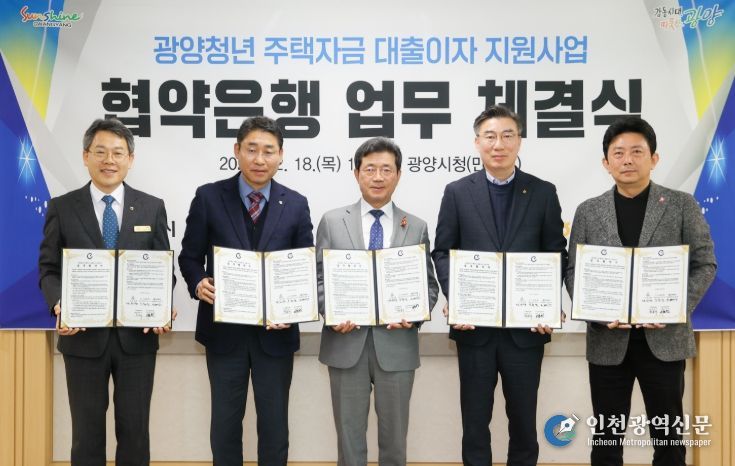 [인천광역신문] 박진 기자 | 광양시는 2026년도 청년주택자금 대출이자 지원사업 추진에 앞서 보다 효율적인 사업 운영을 위한 협력 체계를 구축하고자, 지난 19일 시청 만남실에서 관내 4개 금융기관(신한은행, NH농협은행, 광양농협, 동광양농협)과 청년 주택자금 대출이자 지원사업업무협약을 체결했다.