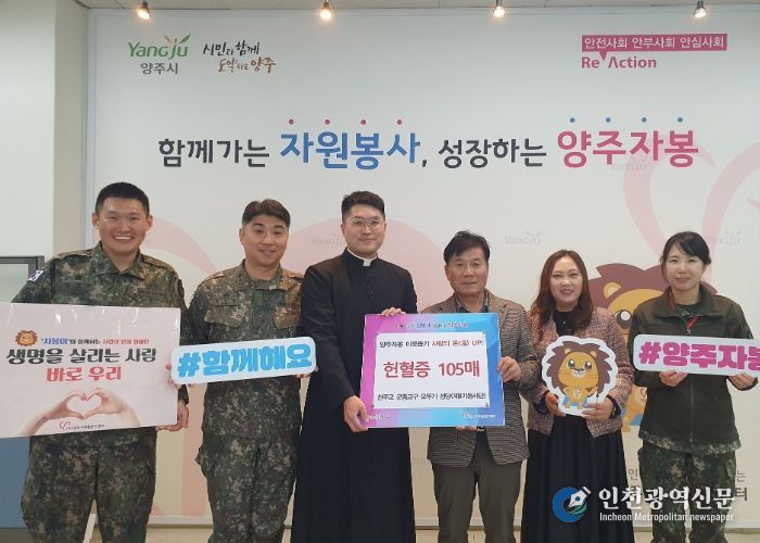 [인천광역신문] 박진 기자 | 양주시자원봉사센터는 천주교 군종교구 오뚜기 성당(제8기동사단) 오형훈 군종신부와 군 장병들이 연말을 맞아 헌혈증 105장을 기부했다고 밝혔다.