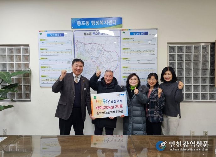 [인천광역신문] 박진 기자 | 이천시 증포동은 지난 12월 19일 증포동행정복지센터에서 증포2통 노인회 김용문 회장이 관내 취약계층을 위해 백미(20kg) 30포를 기탁했다고 밝혔다.