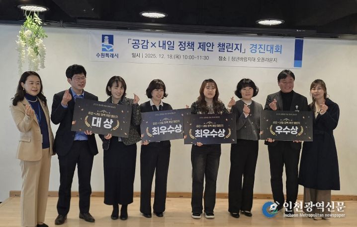 [인천광역신문] 박진 기자 | 수원특례시가 개최한 ‘2025 공무원 대상 제안 공모전 '공감×내일 정책 제안 챌린지' 경진대회’에서 ‘신(新)사장 과태료 0원 프로젝트(찾아가는 원산지 안심 컨설팅)’가 대상을 받았다.
