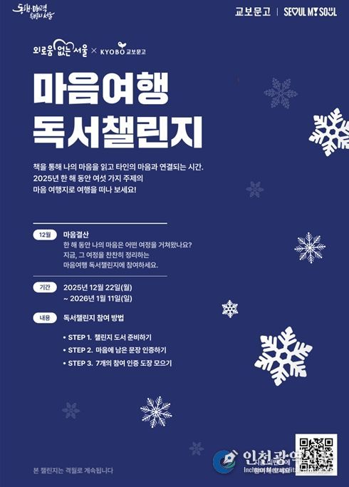 [인천광역신문] 박진 기자 | 서울시가 ‘외로움 없는 서울’을 만들기 위한 노력의 일환으로 교보문고와 함께 여섯 번째 ‘마음여행 독서챌린지’를 진행한다. 이번 챌린지는 ‘마음결산’을 주제로, 올해 나의 마음을 움직인 책과 그 속에서 기억에 남는 문장을 선택해 ‘2025 마음결산 리포트’를 완성하며 한 해의 여정을 마무리한다.