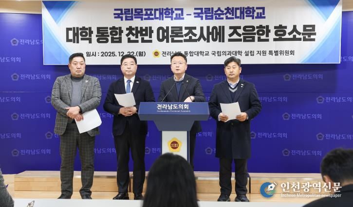 [인천광역신문] 박진 기자 | 전라남도의회 통합대학교 국립의과대학 설립 지원 특별위원회는 교육부 통폐합 심사위원회 결정을 앞두고 오늘부터(22~23일) 진행 중인 국립목포대학교–국립순천대학교 통합 찬반 투표와 관련해, 양 대학 구성원의 적극적인 관심과 참여를 촉구하는 호소문을 12월 22일 발표했다.