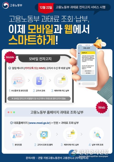 [인천광역신문] 박진 기자 | 고용노동부는 고용노동관계법 위반 과태료 고지서의 간편한 조회·납부를 위해 과태료 전자고지 시스템을 구축하고, 12월 22일부터 서비스를 시작한다.