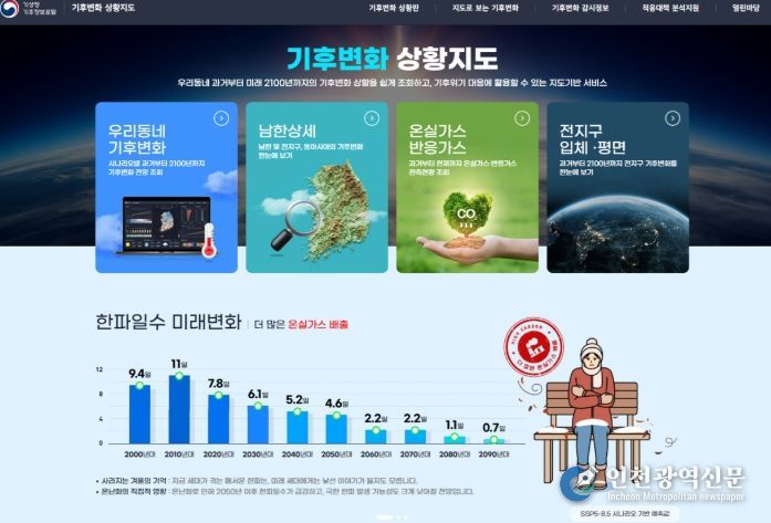 [인천광역신문] 박진 기자 | 기상청은 12월 22일부터 ‘기후변화 상황지도’를 통해 전지구 온난화 수준별 기후변화 예측 정보, 기후변화 영향정보 등 다양한 기후변화 정보를 본격 제공한다.
