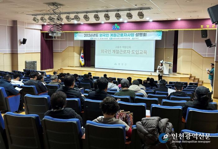 [인천광역신문] 박진 기자 | 함양군은 심각한 농촌 인력난 해소와 농가 경영 안정을 지원하기 위해 지난 20일 함양군농업기술센터 2층 농업인교육관에서 ‘2026년도 외국인 계절근로자 프로그램 사업설명회’를 개최했다고 밝혔다.
