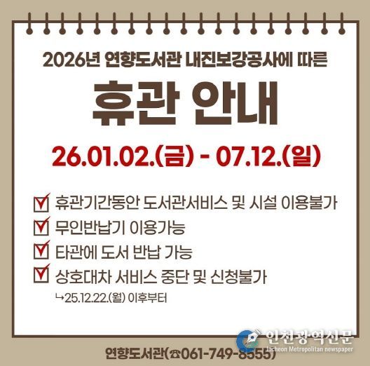 [인천광역신문] 박진 기자 | 순천시는 연향도서관의 지진 대응 능력을 강화하고 시민들에게 안전한 독서 환경을 제공하기 위해 내년 상반기 내진성능 보강공사를 실시한다고 밝혔다.