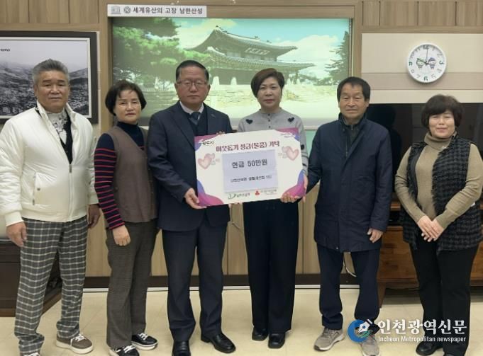 [인천광역신문] 박진 기자 | 광주시 남한산성면 생활개선회는 22일 남한산성면 행정복지센터를 방문해 이웃돕기 성금 50만 원을 기탁했다.