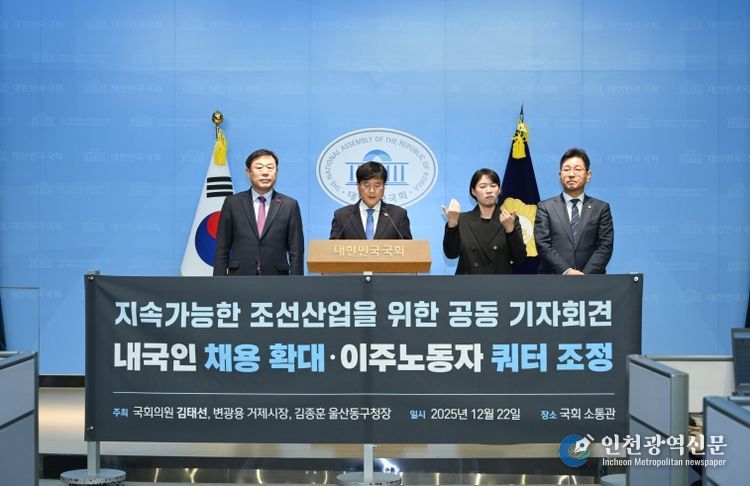 [인천광역신문] 박진 기자 | 변광용 거제시장은 지난 22일 김태선 국회의원(울산동구, 환경노동위), 김종훈 울산 동구청장과 함께 국회 소통관에서 기자회견을 열고, ‘조선산업기본법’ 제정, 내국인 채용 확대, 외국인 쿼터 축소를 골자로 한 고용구조 전환의 필요성을 정부에 촉구했다.