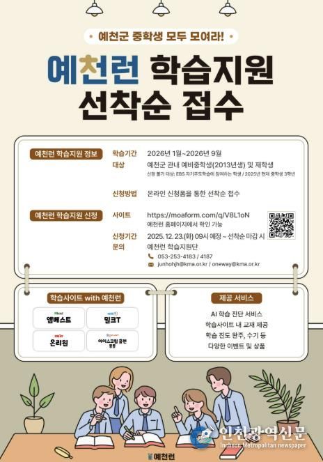 [인천광역신문] 박진 기자 | 예천군은 지역 청소년의 학습격차 해소와 자기주도학습 역량 강화를 위해 추진 중인 AI 기반 학습지원 사업 ‘예천런’에 참여할 예비 중학교 1학년 및 재학생을 추가 모집한다.