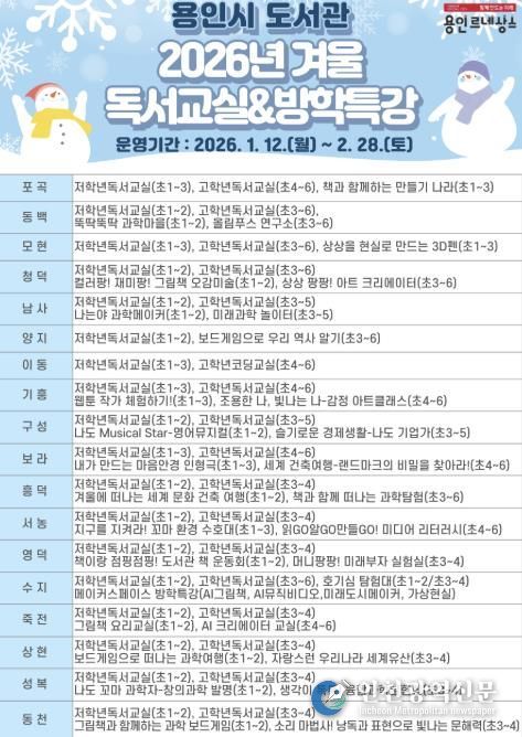 [인천광역신문] 박진 기자 | 용인특례시는 내년 1월 12일부터 2월 28일까지 도서관에서 겨울 독서 교실과 방학 특강을 운영한다고 밝혔다.