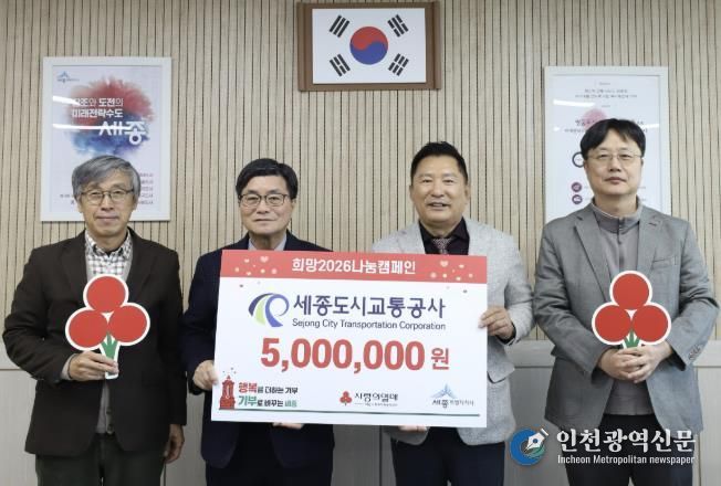 [인천광역신문] 박진 기자 | 세종도시교통공사는 22일 세종사회복지공동모금회에 ‘희망2026 나눔캠페인’ 성금 500만 원을 기탁했다.