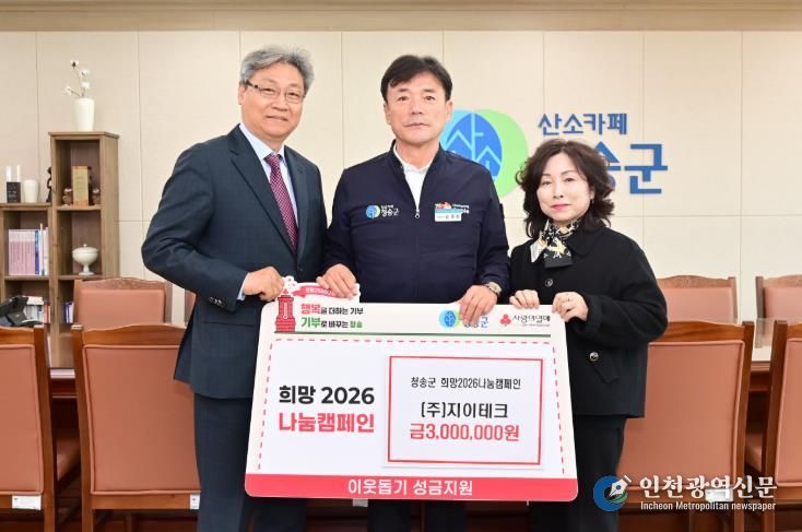 [인천광역신문] 박진 기자 | 청송군은 지난 22일 대구시에 소재한 하수도 기술진단 및 환경기술전문업체 ㈜지이테크가 이웃돕기 성금 300만 원을 기탁했다고 밝혔다.