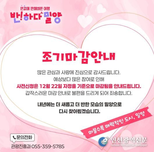 [인천광역신문] 박진 기자 | 경남 밀양시는 ‘반하다밀양 반값여행’ 환급(페이백) 행사 사전 신청을 22일 자정 기준으로 조기 마감한다고 전했다. 크리스마스와 연말 연초를 앞두고 신청이 급증하면서 잔여 예산이 예상보다 빠르게 소진될 것으로 판단돼 접수 종료를 결정했다는 설명이다.